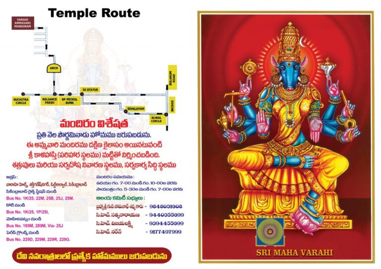 శ్రీ తిరుక్కన్ సింహ వారాహి అమ్మవారి దేవస్థానం ఉపాసకర్ తపోపీఠం, జొన్నబండ వారాహీ హిల్స్ శక్తిగణేశ్ నగర్ అల్వాల్ హిల్స్ సికింద్రాబాద్… రండి.. అమ్మవారిని నిబద్ధతతో.. భక్తి శ్రద్ధలతో విశేషంగా పూజించి సంపూర్ణ అనుగ్రహాన్ని పొందండి…శ్రీ వారాహీ దేవి ఆది పరాశక్తి రూపాల్లో పరమోత్కృష్ట అవతారం.సప్త మాతృకలు అయినటువంటి.. బ్రాహ్మి. మాహేశ్వరి..కౌమారి.. వైష్ణవి..వారాహీ..ఇంద్రాణి.. చాముండీ..శక్తిదేవతలలో విశిష్ట శక్తిదేవత. దశమహా విద్యలకు అధిదేవత.విష్ణువు వరాహ అవతారo కనుక వారాహీ మాత ను విష్ణువు సోదరిగా కీర్తిస్తారు. శ్రీ మహావిష్ణుని వరాహరూపం ఆత్మ శక్తి వారాహీ దేవి.అందువలననే వరాహ ముఖం కలిగివుంటుంది.శ్రీ రాజరాజేశ్వరి పరాంబిక తరువాత అంతటి మహిమాన్విత శక్తి గా అవతరించి మంత్రిణి దండినులలో శ్రీ పరమేశ్వరికి దండనాయికైన శ్రీ వారాహీదేవి వరాహచక్రం అనే దివ్య రథాన్ని అధిరోహించి..వరాహ ముఖం కలిగి చతుర్భుజాలతో…చిద్ఘనము..సద్రూపము.. హలము. ముసలము.. లను ఆయుధాలుగా ధరించి..మరో రెండు హస్తములతో అభయవరద ముద్రలతో దర్శనమిస్తుంది.శ్రీ లాలితాపరమేశ్వరి సేన అయినటువటవంటి శక్తిగణములకు ఈ దేవి అధినేత్రి..వారాహీ దేవి శత్రు నిగ్రహకారిణి.. వారాహీ దేవి స్తోత్ర పఠనం వలన సర్వ దుఃఖములు నశించును.స్వప్న ఫలములు బోధించును.శ్రీ వారాహీ దేవిని మనసులో తలచినంతనే శత్రువులు నిగ్రహింపబడతారు.భక్తులకు ఎనలేని శుభాలను అనుగ్రహించే వరప్రదాయిని.భక్తుల పట్ల ఎల్లప్పుడూ కరుణాకటాక్షాలను ప్రసరించే కరుణామయి..కోరిన కోర్కెలను శీఘ్రముగా నెరవేర్చే క్షిప్రప్రసాదిని. తన భక్తులకు ఎటువంటి విఘ్నాలూ ఆపదలూ కలగకుండా కాపాడే జగజ్జనని..పూర్వం హిరణ్యాక్షుడనే రాక్షసుడ్ని సంహరించి భూలోకాన్ని ఉద్ధరించిన విష్ణువు అవతారమే వరాహమూర్తి.ఆ వరాహమూర్తి స్త్రీతత్వమే వారాహీ..దేవీ భాగవతం మార్కండేయ పురాణాలలో వారాహీ ప్రసక్తి ఉంది.అంధకాసురుడు రక్తబీజుడు శుమ్భ నిశుమ్భ రాక్షసులను సంహరించడంలో వారాహీ పాత్ర సుస్పష్టంగా ఉంటుంది. వారాహీ రూపం వరాహమూర్తిని పోలివుంటుంది.నల్లని మేఘవర్ణ శరీర ఛాయ. వరాహ ముఖం తో ఎనిమిది చేతులతో అభయ వరద హస్తాలతో శంఖం చక్రం పాశం హలం వంటి ఆయుధాలు ధరించి ఉంటుంది.గుర్రం సింహం పాము దున్నపోతు వంటి వివిధ వాహనాలమీద సంచరిస్తుంది….తాంత్రికులకు ఇష్టమైన దేవత వారాహీ మాత. అందుకే ఈ శక్తిమాతను రాత్రివేళల్లో పూజిస్తుంటారు.కొన్ని ఆలయాలలో తెల్లవారు ఝామున రాత్రివేళల్లో మాత్రమే దర్శనం ఉంటుంది.దేశంలోని వివిధ ప్రాంతాల్లో వారాహీ మాత ఆలయాలున్నాయి..ఒడిశా వారణాశి తంజావూరు చెన్నై మైలాపూర్ తెలంగాణ రాష్ట్రం సికింద్రాబాద్ జొన్నబండ శక్తిగణేష్ నగర్ ఓల్డ్ అల్వాల్ వారాహీ హిల్స్ లో విశేష ఆలయాలున్నాయి..శ